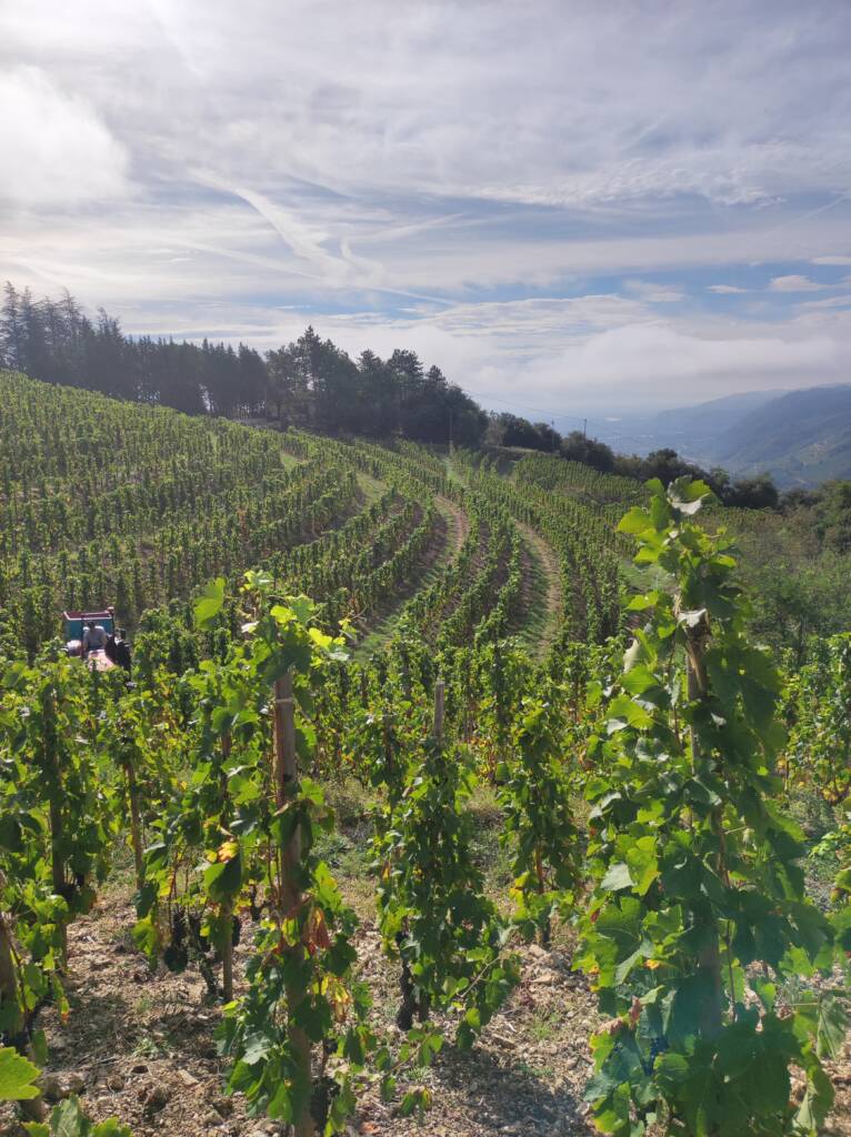 Les coteaux abrupts de granit altéré sur lesquels s’étendent nos vignes imposent un travail minutieux, à la main, pour préserver la santé du sol et la qualité des raisins. Les deux parcelles d’IGP Collines Rhodaniennes sont palissées sur fils, tandis que les Saint-Joseph situés dans les pentes sont travaillés sur échalas, avec un travail du sol au treuil et des travaux en vert manuels réguliers.